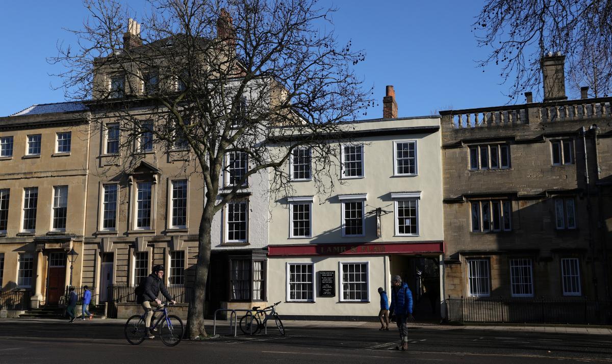 - Паб Lamb and Flag ("Ягня і прапор") вперше відкрився в 1566 році та був перенесений на своє нинішнє місце по вулиці Сент-Джайлс в центрі Оксфорда в 1613 році. Він належить коледжу Святого Іоанна ( St John's College) - одному з 45 коледжів і приватних холів, що складають Оксфордський університет.